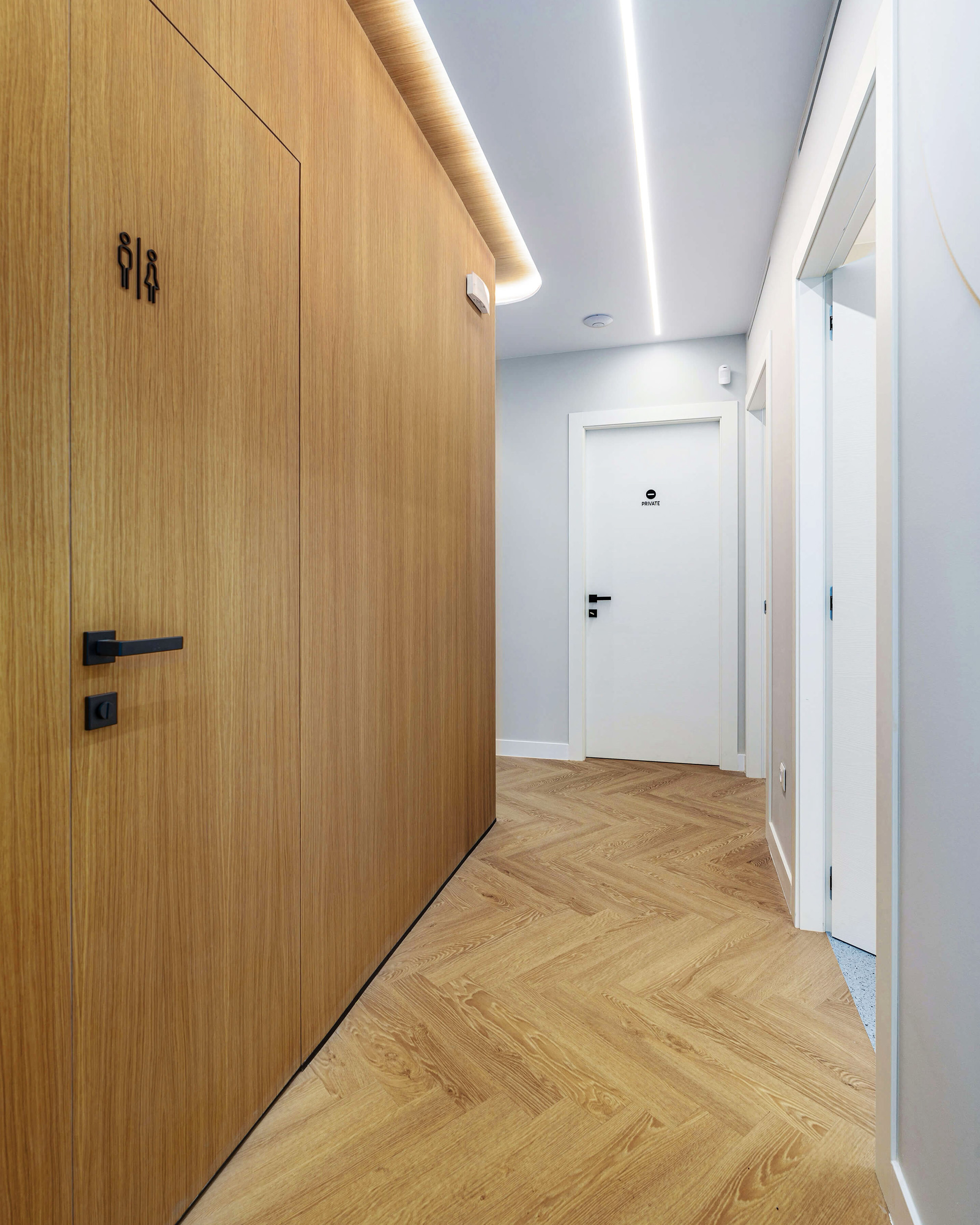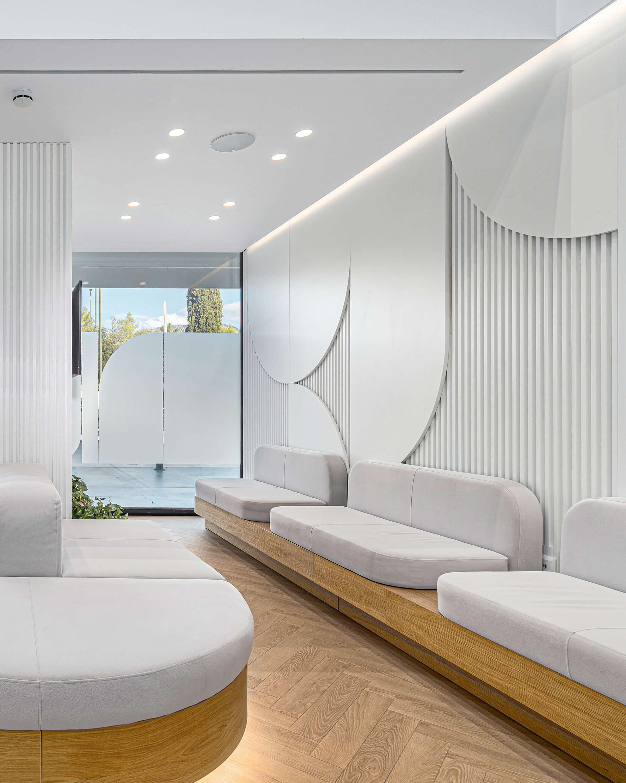 Οι κοινόχρηστοι χώροι χαρακτηρίζονται από γλυπτικές επιφάνειες τοίχων, ειδικές κατασκευές και custom στοιχεία επίπλωσης, με ενσωματωμένο φωτισμό που “δουλεύει” σαν ατμόσφαιρα και όχι σαν εφέ. Το αποτέλεσμα είναι μια συνεκτική αρχιτεκτονική ταυτότητα που ισορροπεί ανάμεσα στο απολύτως επαγγελματικό και στο ανθρώπινα φιλόξενο.