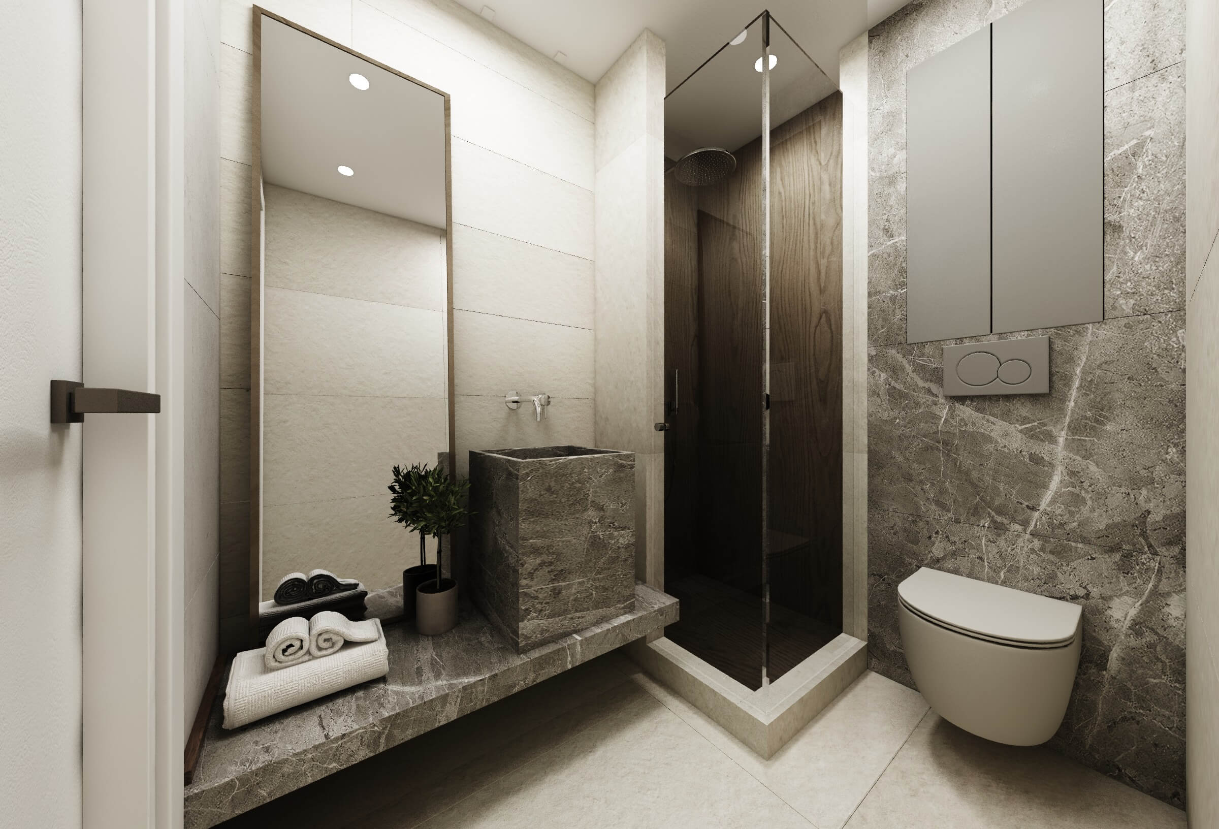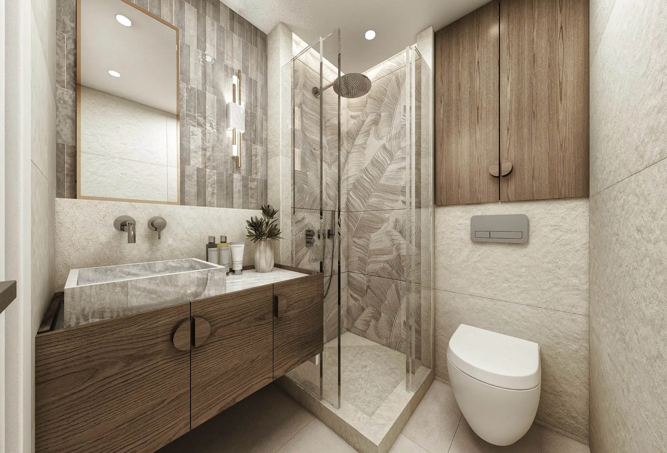 Every villa unfolds on two levels and includes three bedrooms, an open-plan living and kitchen area, and an exclusive outdoor space with a private swimming pool and shaded patio.
