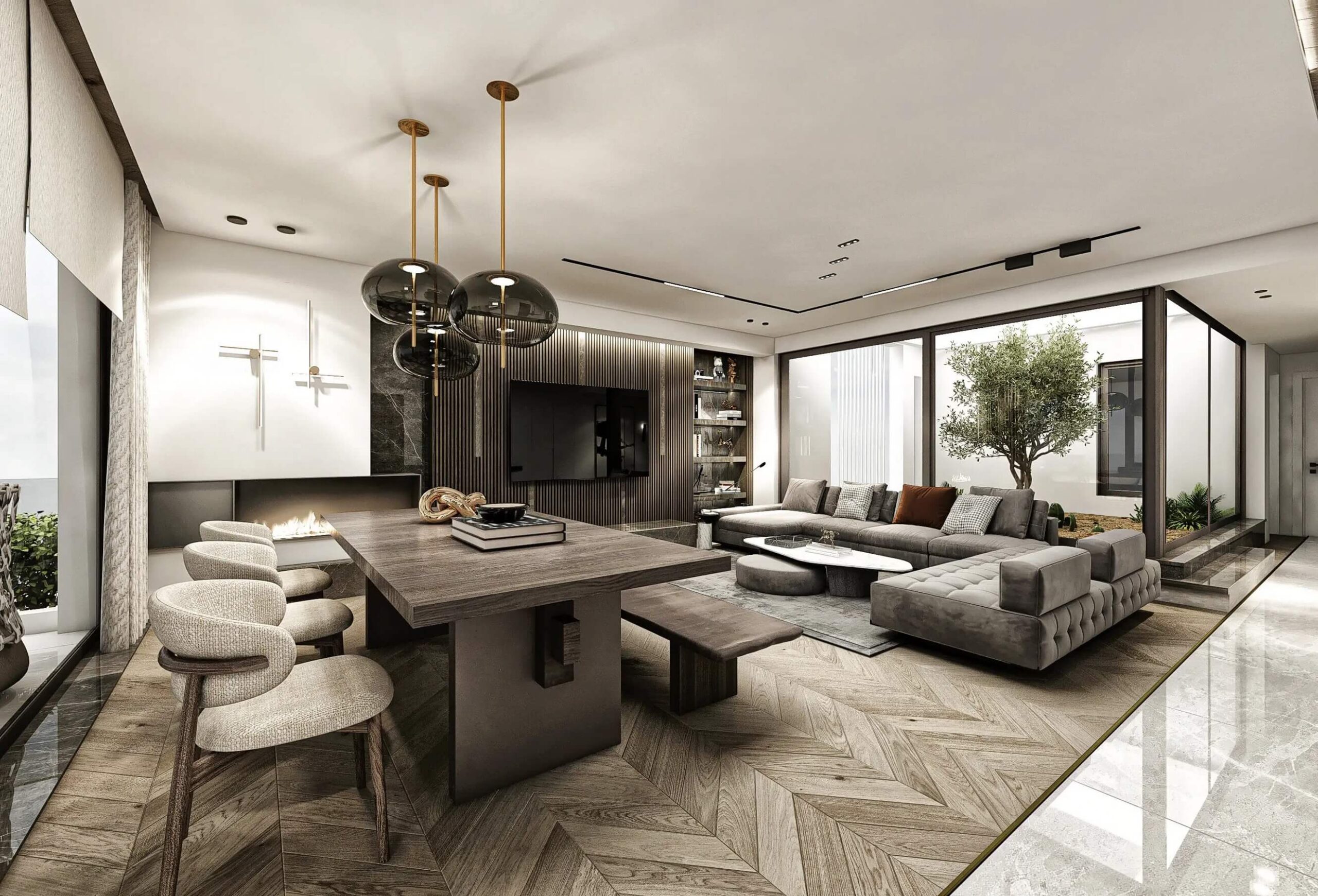 The design prioritizes both functionality and atmosphere—every space is carefully positioned to enhance the dialogue between indoor and outdoor living, offering a seamless transition from the interior comfort to the Mediterranean garden and pool area.